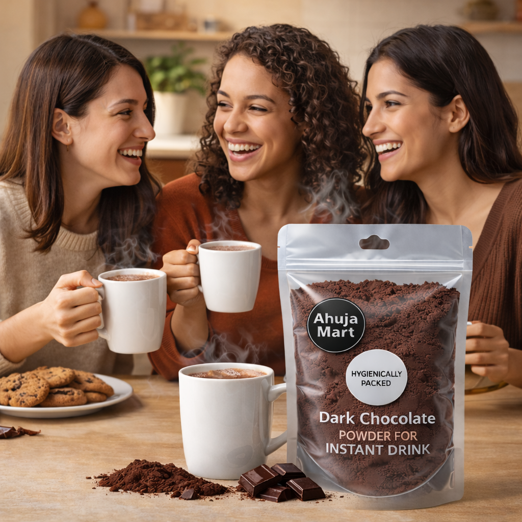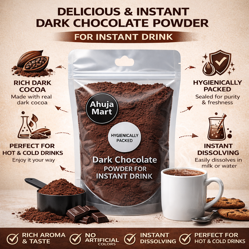 Elevate your beverage game with Ahuja Mart Dark Chocolate Powder. Crafted for true chocolate aficionados, our premium blend offers the perfect balance of intense cocoa notes and subtle sweetness. Whether you are craving a steaming mug of hot cocoa on a winter evening or a refreshing iced chocolate frappe in the summer, this versatile powder delivers a professional-grade taste right at home.Unlike standard cocoa powders, our formula is designed for instant solubility, ensuring no grainy residue at the bottom of your cup. It’s “Hygienically Packed” to meet the highest safety standards, making it a healthy and delicious choice for kids and adults alike. Upgrade your pantry with the rich, bold taste of Ahuja Mart.